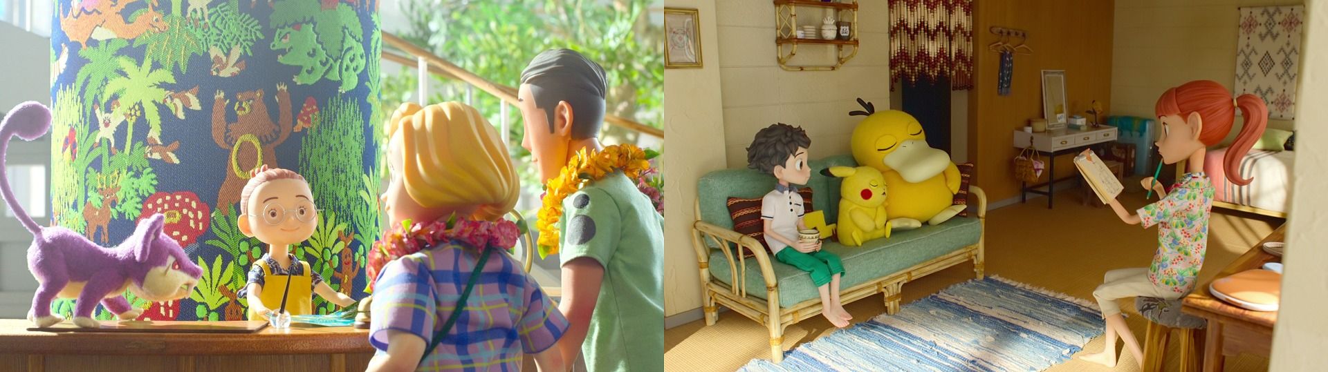 A great deal of attention and detail also went into creating the sets where Haru and the Pokémon cast were filmed and the props being used. The concierge counter where Haru greets guests, for example, features a pillar of eye-catching design, wrapped in beautifully embroidered cloth. The lamps, made in Pokémon shapes, were created to look just like glass. All backdrops and every featured item make the world of Pokémon Concierge colorfully appealing to the eye.